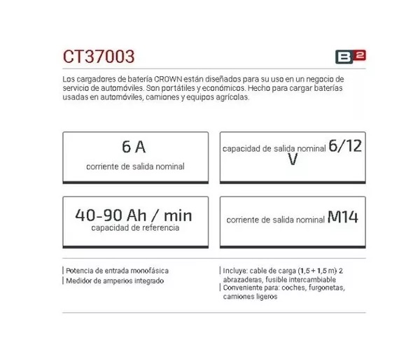 Cargador portátil monofásico para cargar baterías de plomo ácido con un voltaje de 6 a 12V y una potencia de 128W y arrancar todo tipo de vehículos (Autos, Camionetas y pequeños camiones). Tiene un circuito transformador robusto con función de carga rápida. Protección contra cortocircuitos, inversión de polaridad y sobrecarga térmica. Equipado con un amperímetro de fácil lectura para controlar la corriente de carga. Tiene una construcción duradera totalmente metálica para garajes y bancos de trabajo. Este cargador es apto para baterías de plomo-ácido de 40 a 120Ah.