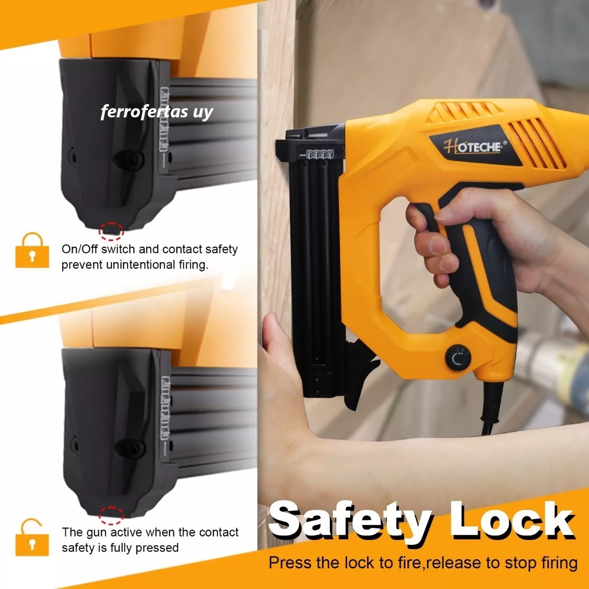 – Seguro de usar: la clavadora está equipada con un interruptor para garantizar la seguridad. Evita clavar las manos o lugares que no deben clavarse. Asegúrate de encender el interruptor cuando sea necesario, y luego presiona el gatillo para disparar clavos, apaga el interruptor cuando no esté en uso.
