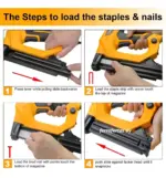 – Amplias aplicaciones: la clavadora/grapadora es adecuada para madera, tablero de mano, plástico y fibra de vidrio. Nota: para algunos materiales duros, úsalo con ambas manos, lo que será más eficaz.