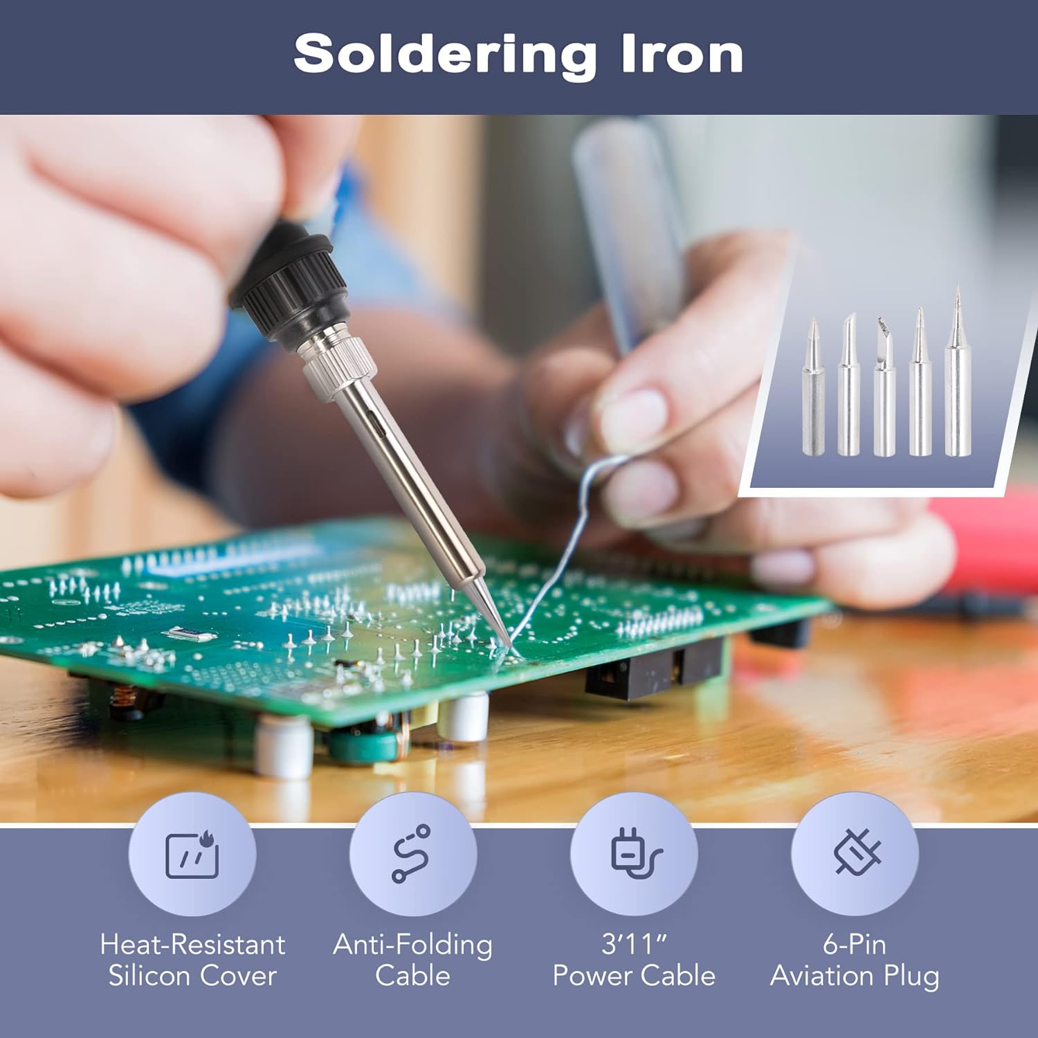 Súper rápido de responder: con la tecnología PID para un control uniforme de la temperatura, la pistola de aire caliente de 750 W se calienta hasta 896.0 °F en 5 segundos y el soldador de 70 W calienta hasta 392.0 °F en 7 segundos y mantiene su temperatura, la pistola de aire caliente sopla a 120 l/min para tu eficiencia de trabajo, la protección de fusible integrada garantiza un 100% de seguridad durante el funcionamiento.
